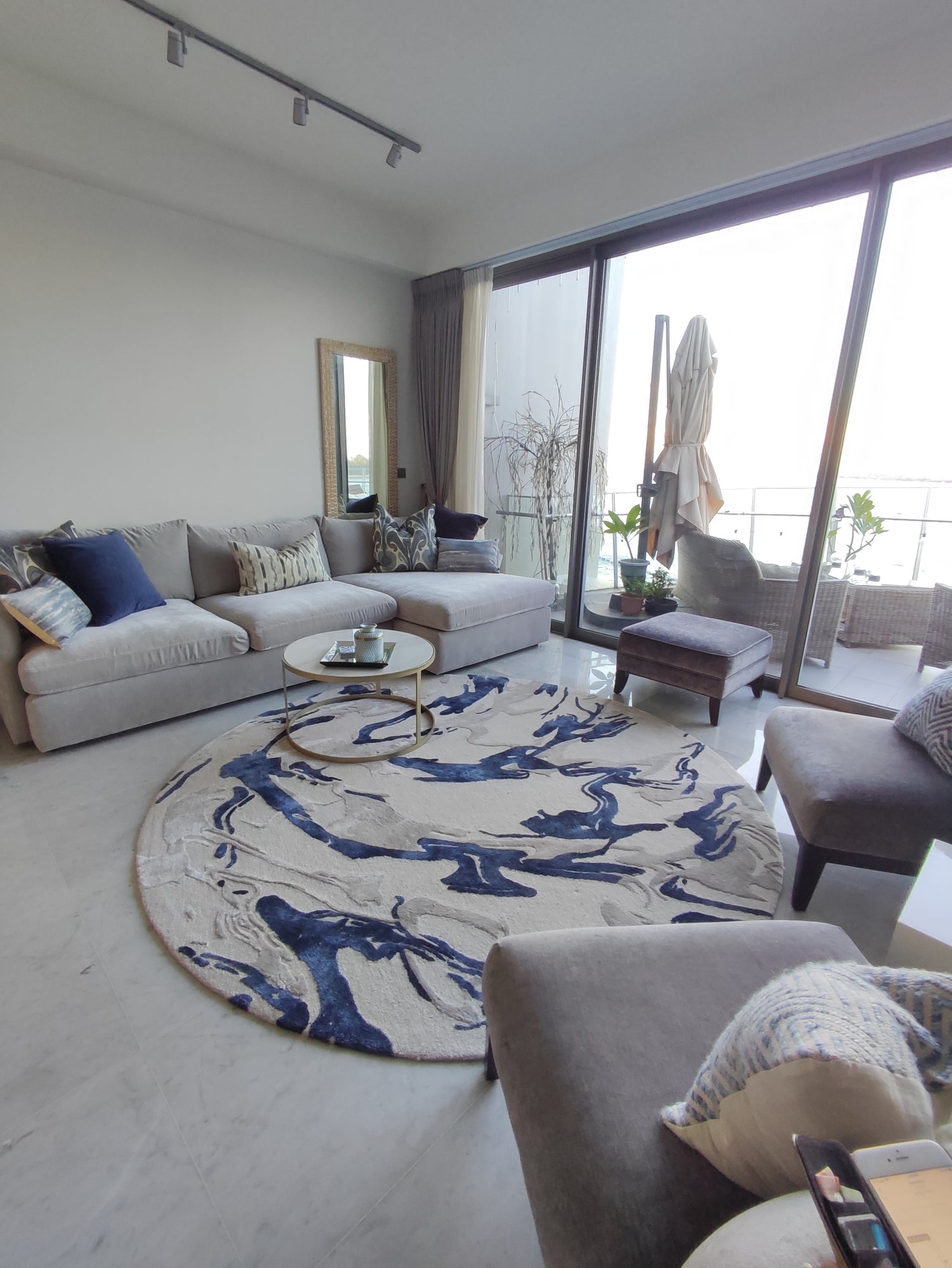 Our customer in Sentosa chose a round "Ocean" rug. The swirls of blue adds a hint of colour brightens the room. Whilst a round rug adds warmth, movement and creates a initmate setting.